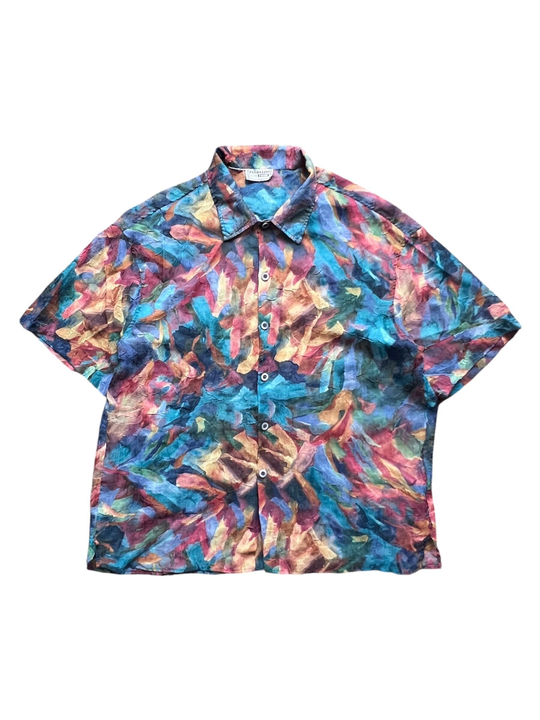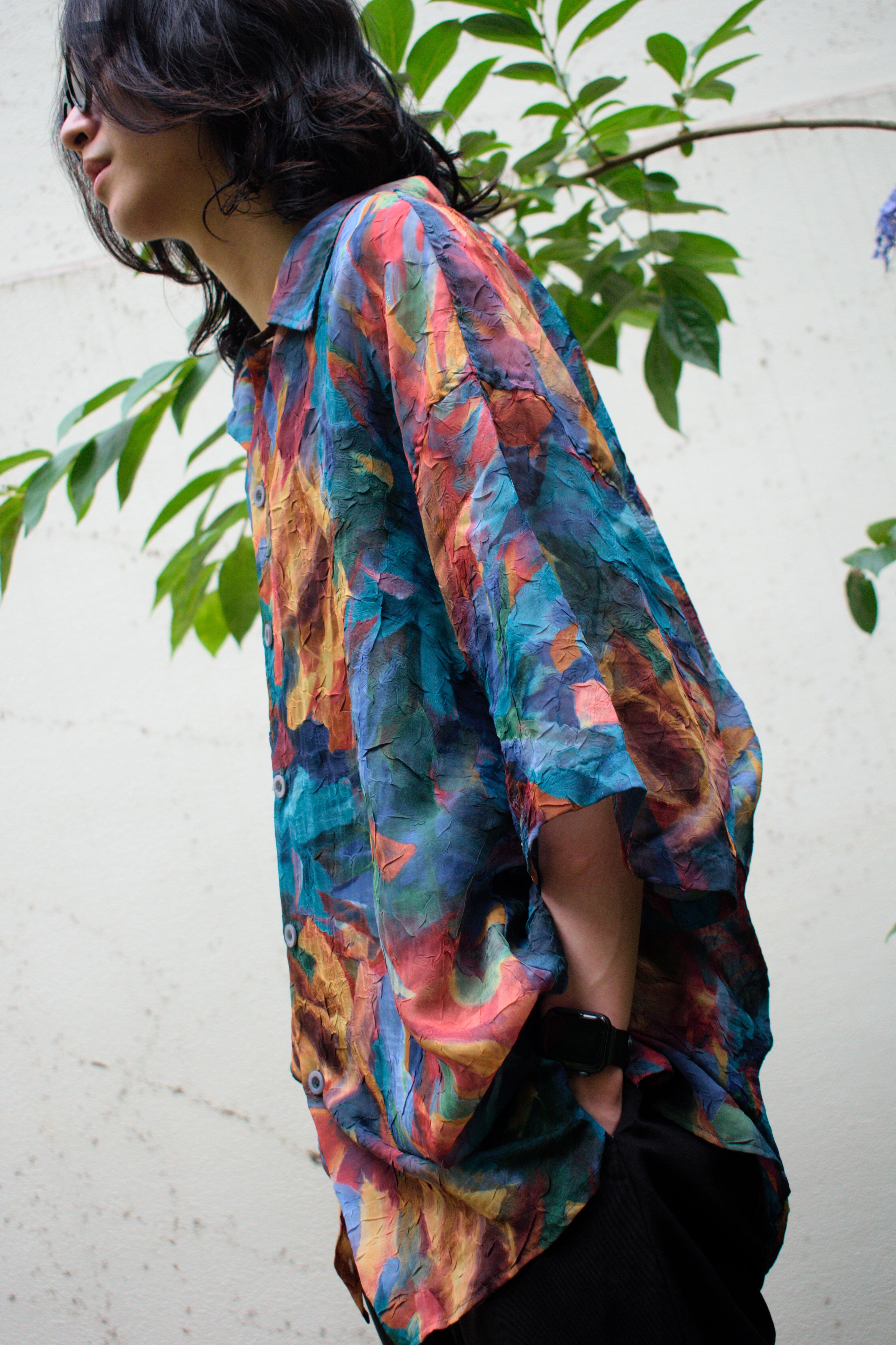 油絵を塗りたくった様な柄をしたデザインシャツ。