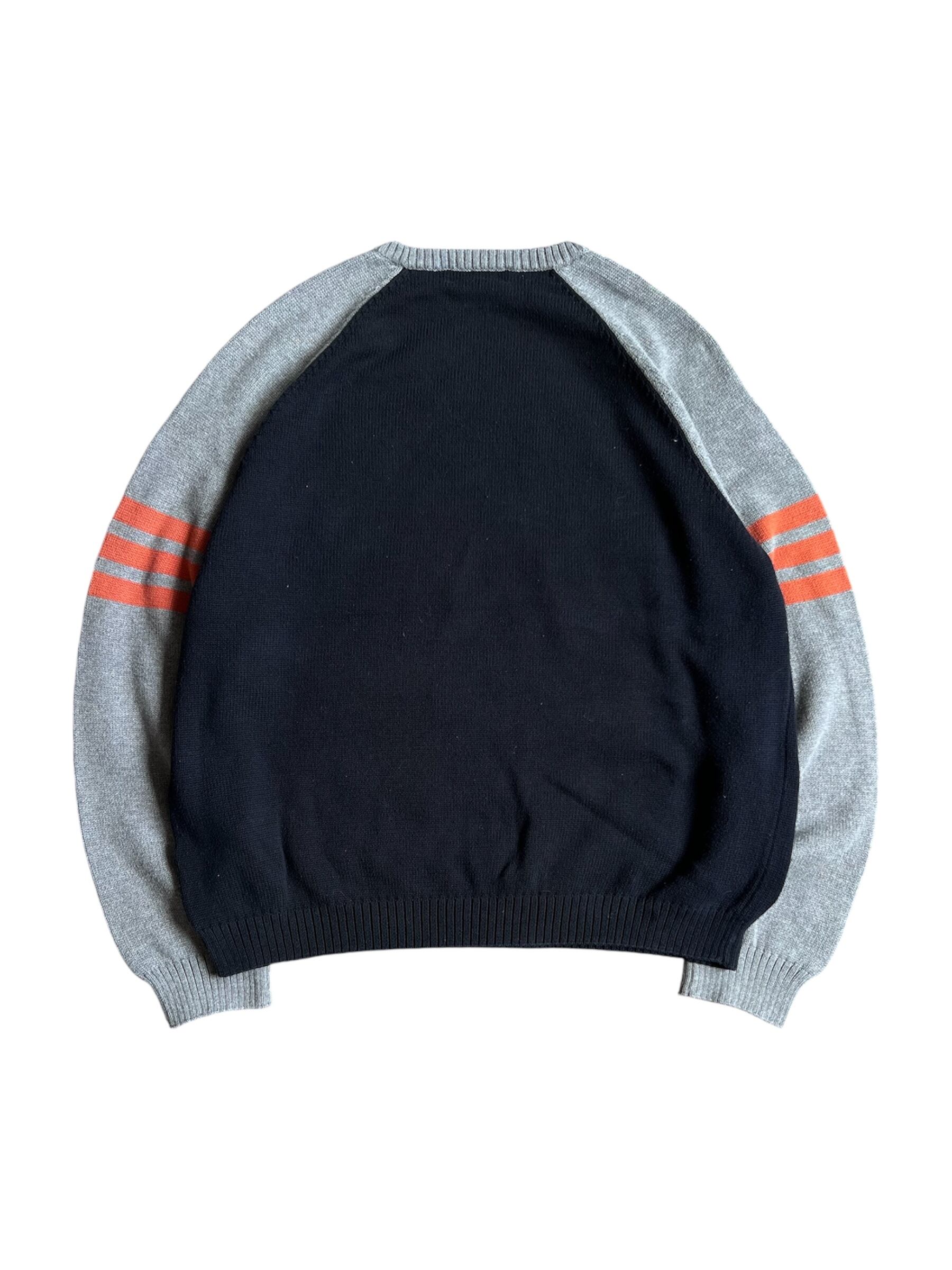 ラグランスリーブのコットンニット、アクセントにサイドラインの3本線のオレンジ、ゆったりとした安心感のあるシルエット。尖りすぎず、シンプルになりすぎず。このニットを一目見た時に「あぁ分かってるなぁ...」と呟いてしまいました。