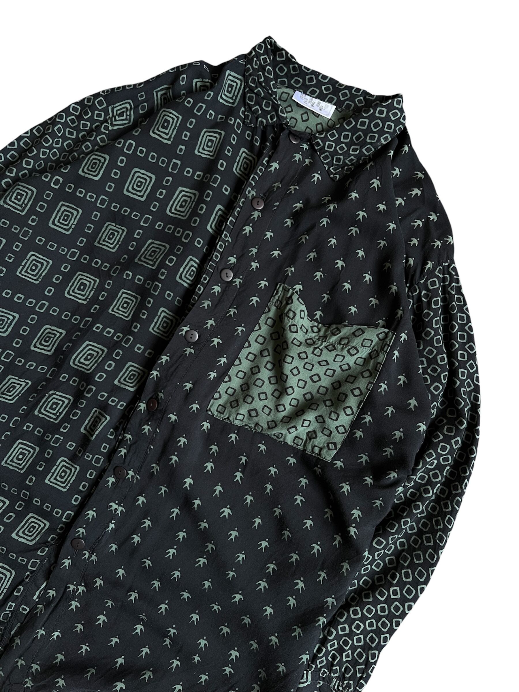 左右で柄を切り替えたアシンメトリーデザインが特徴的な珍しい一枚。しかもレーヨンなんです。大きめの幾何学模様と人型の柄を組み合わせた確実に二度と出会えないシャツ。一見奇抜ですがダークトーンなので着用回数は自ずと増えそうですね。最高です。